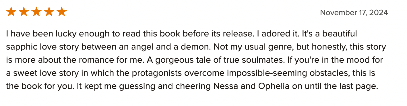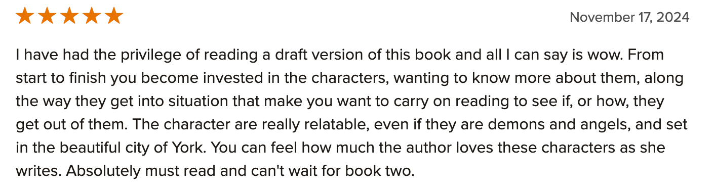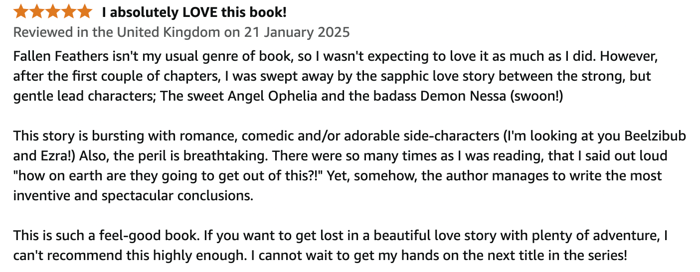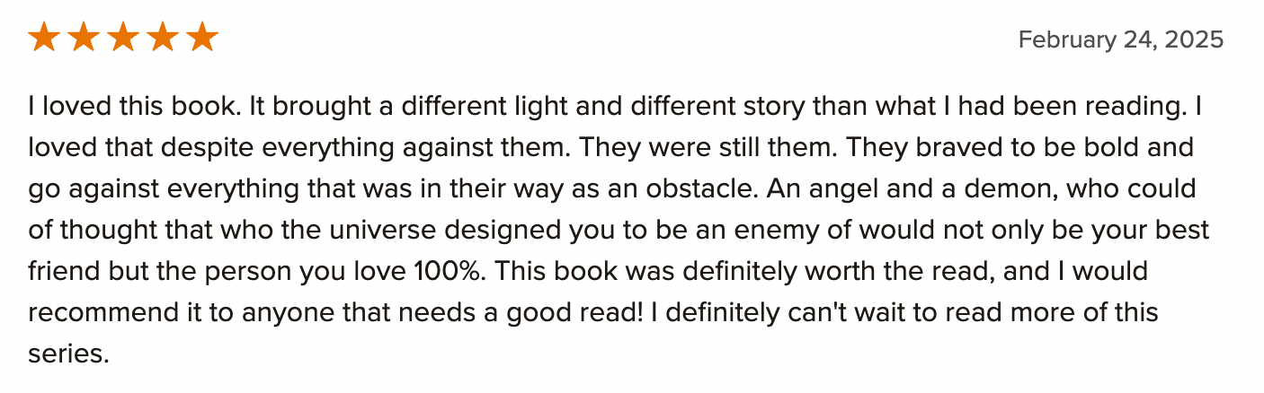 For those seeking a light yet meaningful escape, Fallen Feathers delivers a satisfying mix of romance, defiance, and celestial intrigue. It’s an easy, enjoyable read that makes for a cosy and entertaining experience. If you’re after a story that gently plays with the idea of fate and freedom without becoming overly complex, this one is well worth your time.