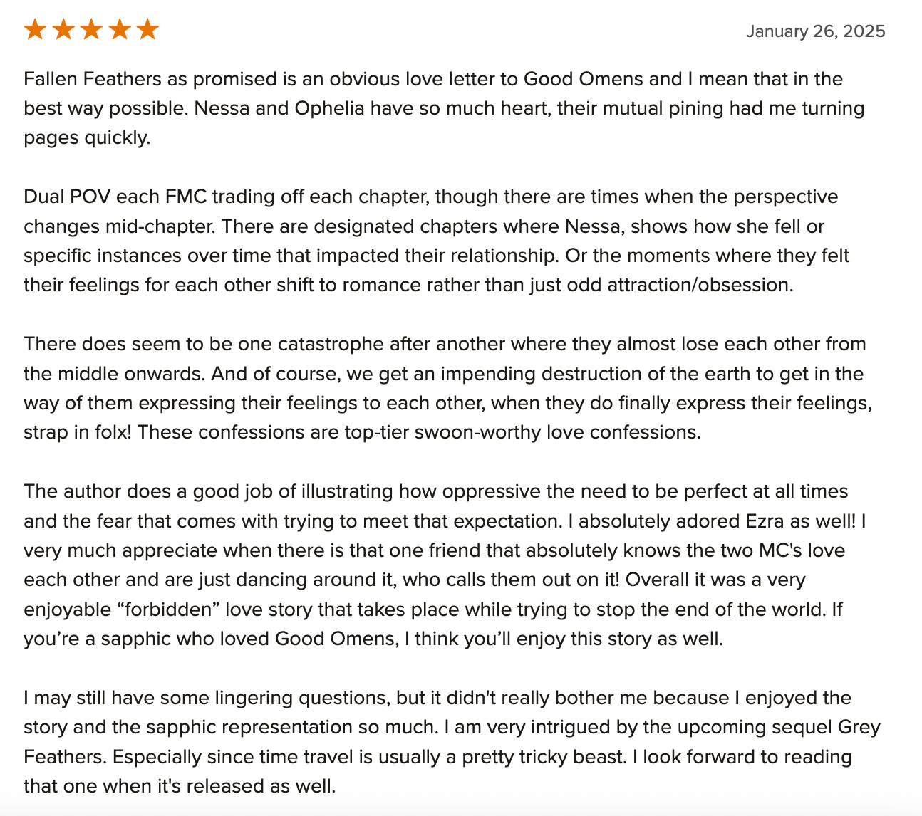 In July 2025, Fallen Feathers was reviewed and recommended by The Lesbian Review.